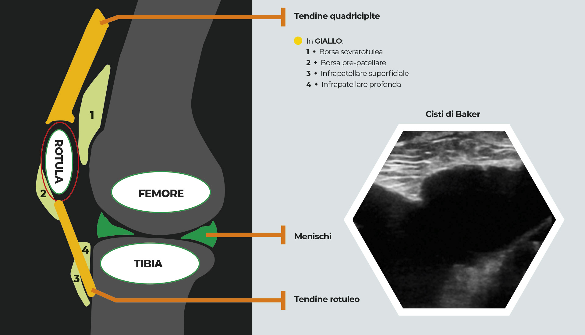 ▸ Borsa del Gastrocnemio-Semimembranoso (Cisti di Baker): situata tra il tendine del muscolo gastrocnemio mediale e il tendine del muscolo semimembranoso, nella regione posteriore del ginocchio. Questa borsa può diventare una cisti (cisti di Baker) in caso di versamento articolare, estendendosi posteriormente e inferiormente, e può causare dolore e limitazione del movimento.